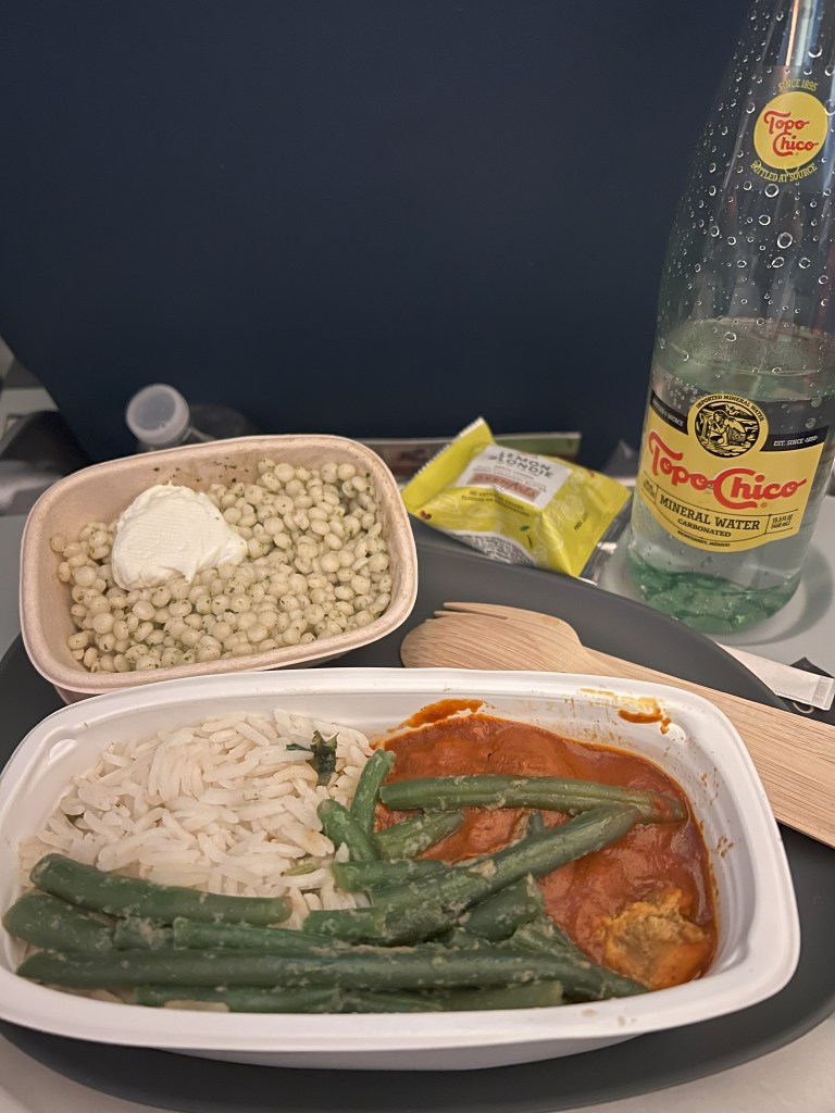If you were wondering if plane food has improved since COVID, here’s a pic to help you decide. The white blob at the top is cheese by the way. We were surprised too when we bit into it. The red stuff at the bottom is probably chicken.