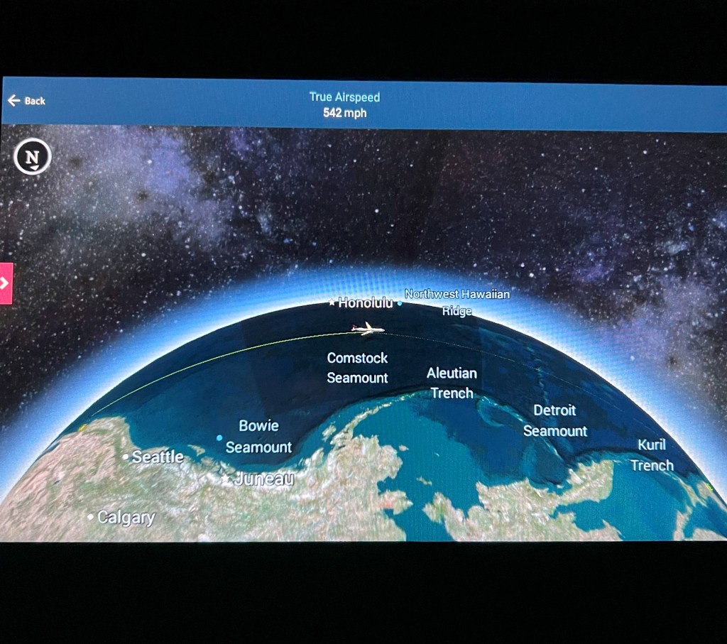 Helpful tip to plane designers everywhere. There are lots of people afraid of flying. The last thing a scaredy cat needs is images plastered all over the plane bringing attention (and graphics!) to things like “You’re going 542 mph” or “You’re flying over the deep, dark scary ocean” or “There’s an Aleutian Trench in that deep, dark, scary ocean. I bet it’s really, really deep!” or “There’s also a Kuril Trench! I bet it’s deeper!” or “You’re 3000 km from help!” or “Russia is the closest land mass!” or “It’s -72 Celsius outside. If someone opens a window, will the lack of oxygen kill you before the cold does??”. I repeat, ignorance is bliss.